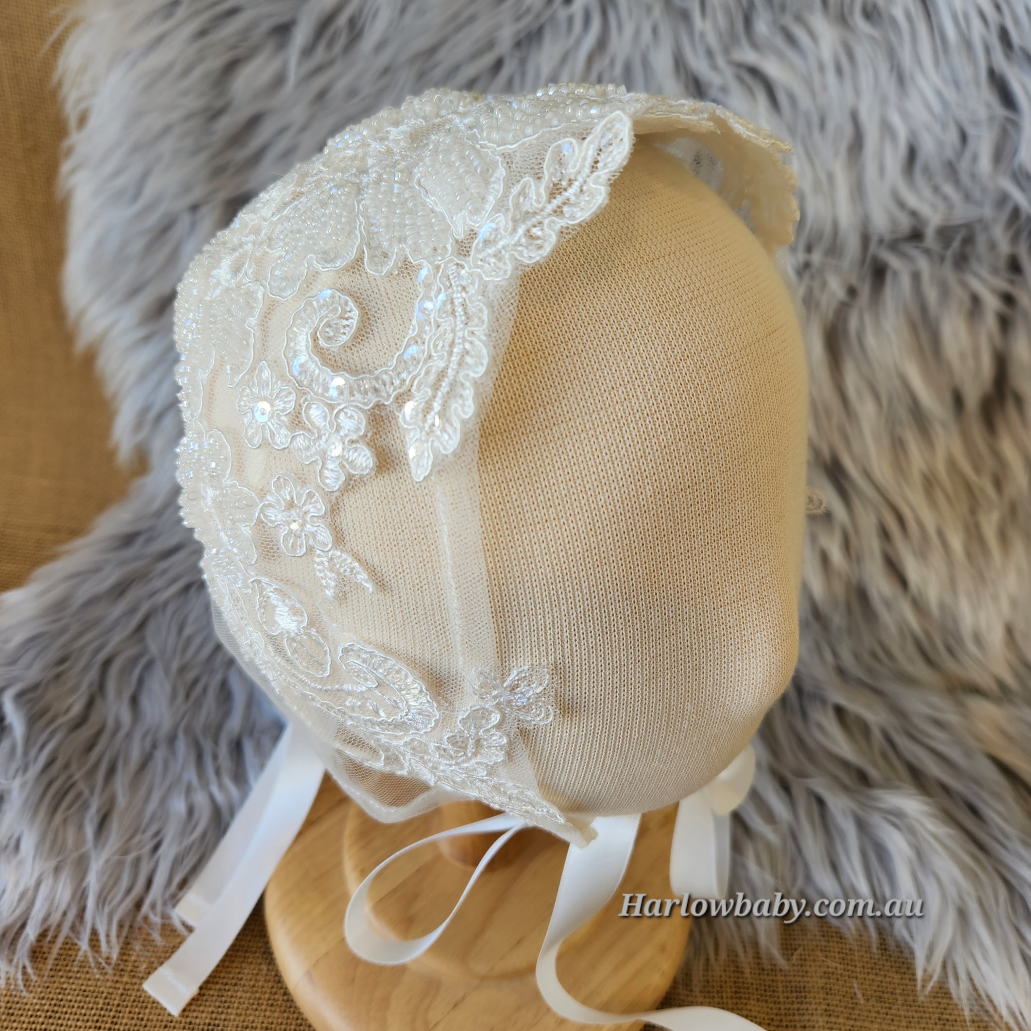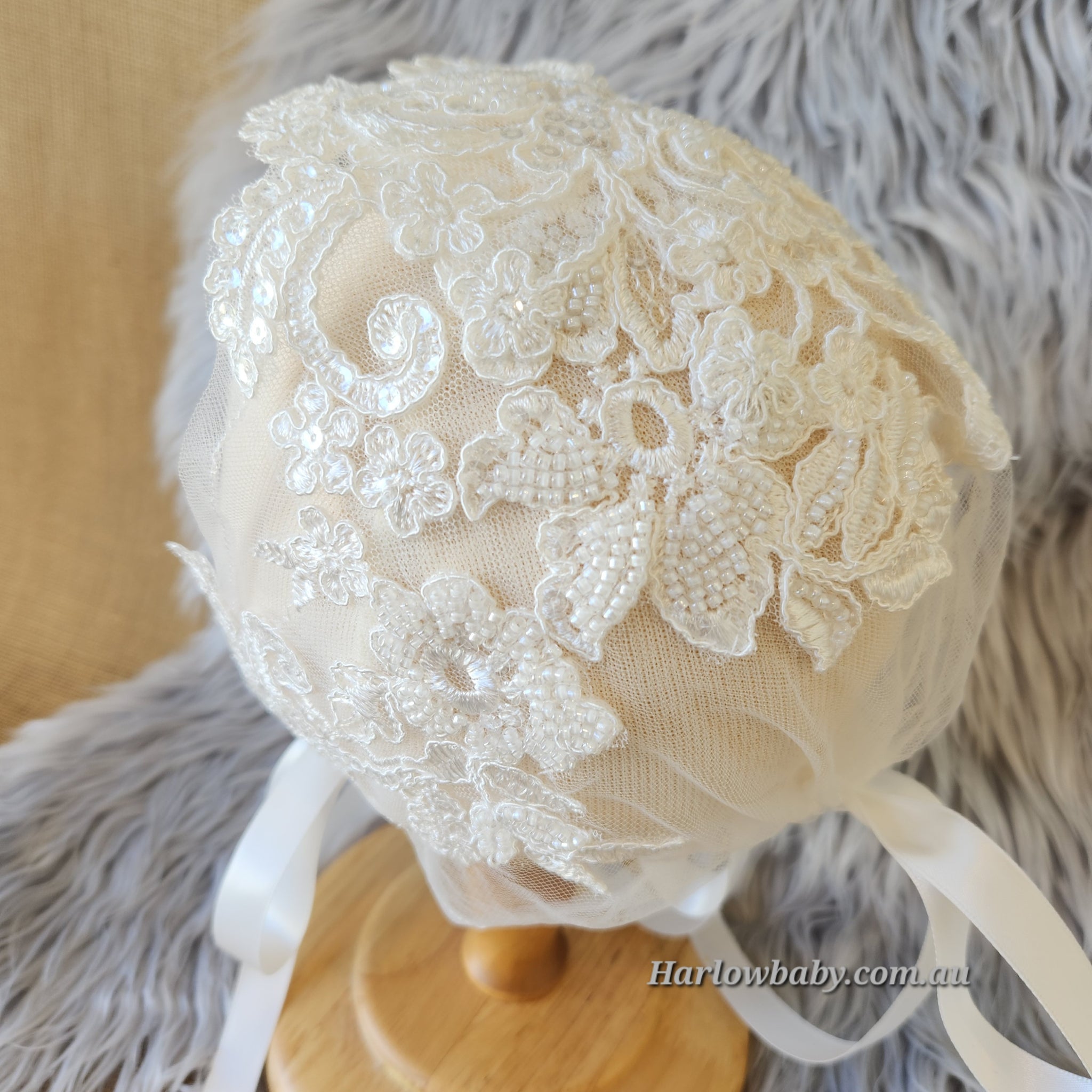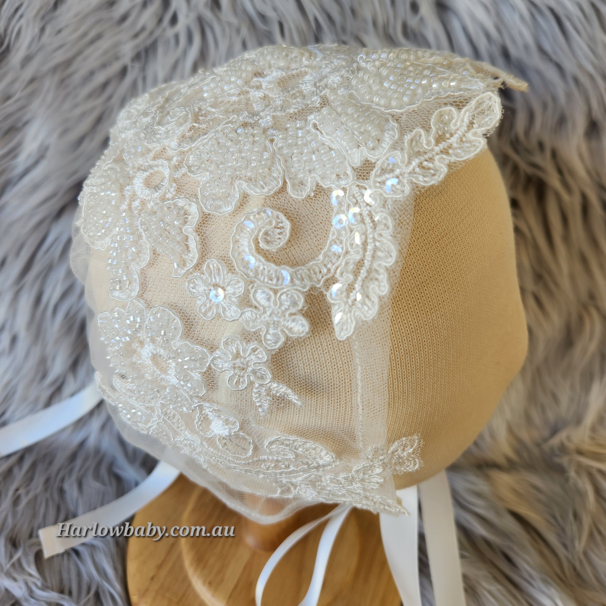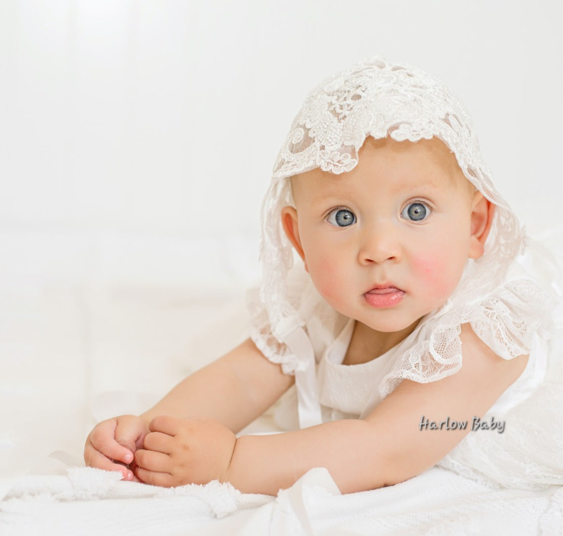 Our gorgeous Camila bonnet is made of a beautiful sequence and beaded floral lace that frames the face. There are ribbons at the bottom which ties into a bow and another ribbon at the back which is adjustable to make the bonnet smaller or bigger.
