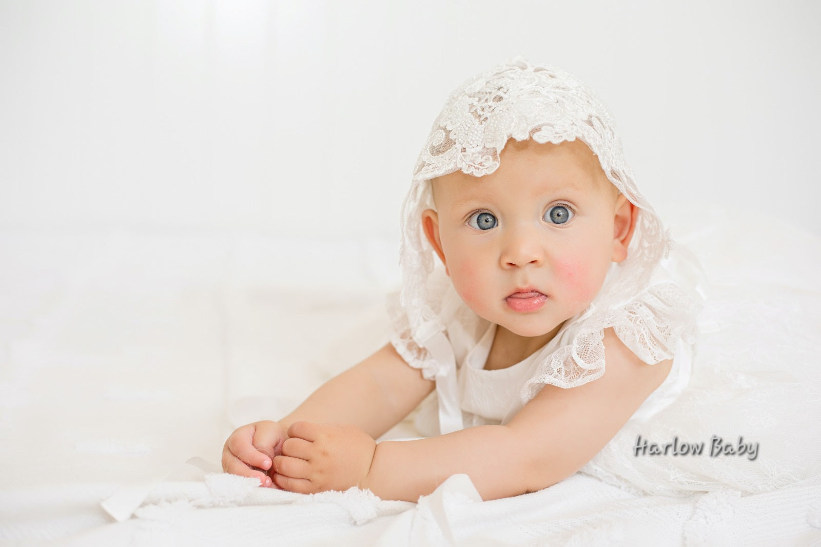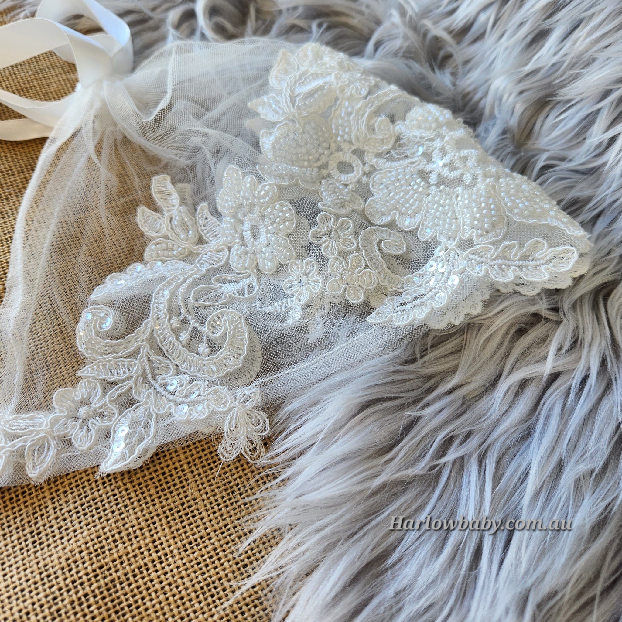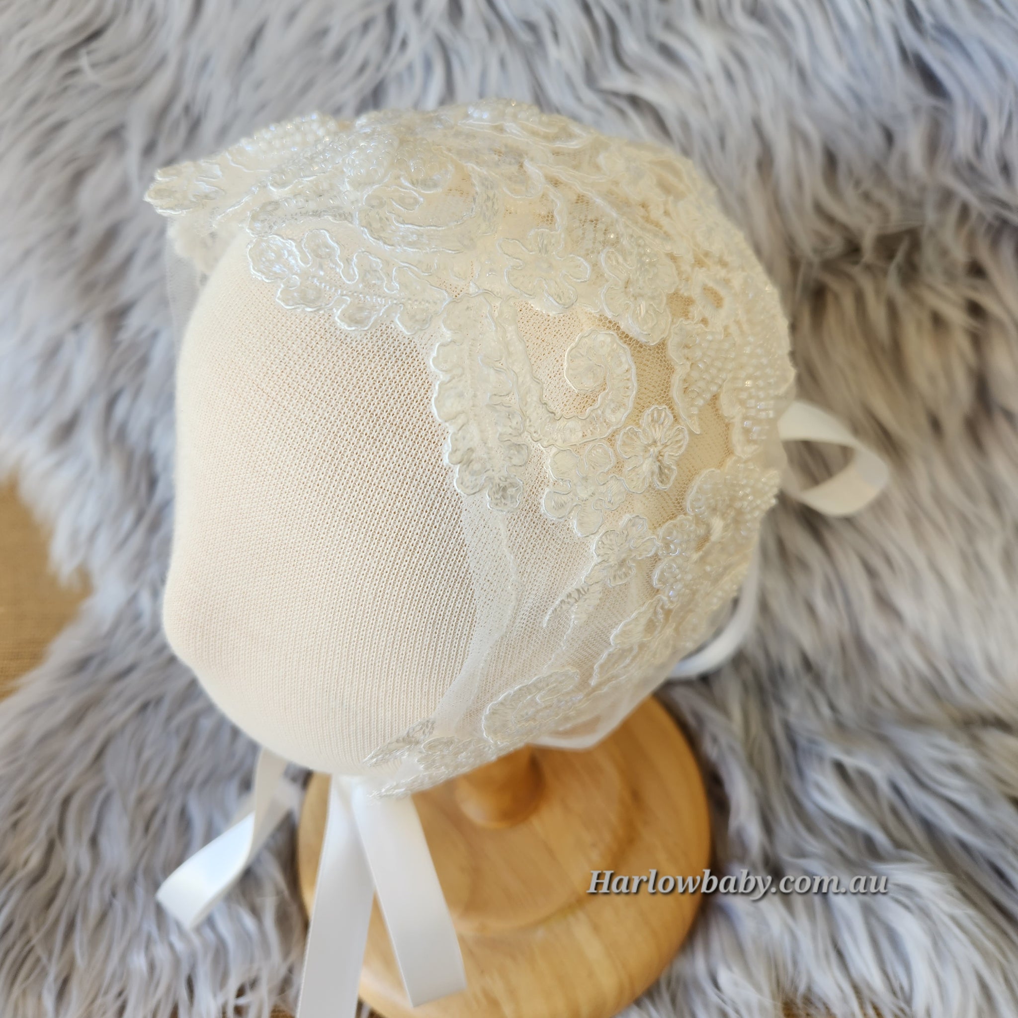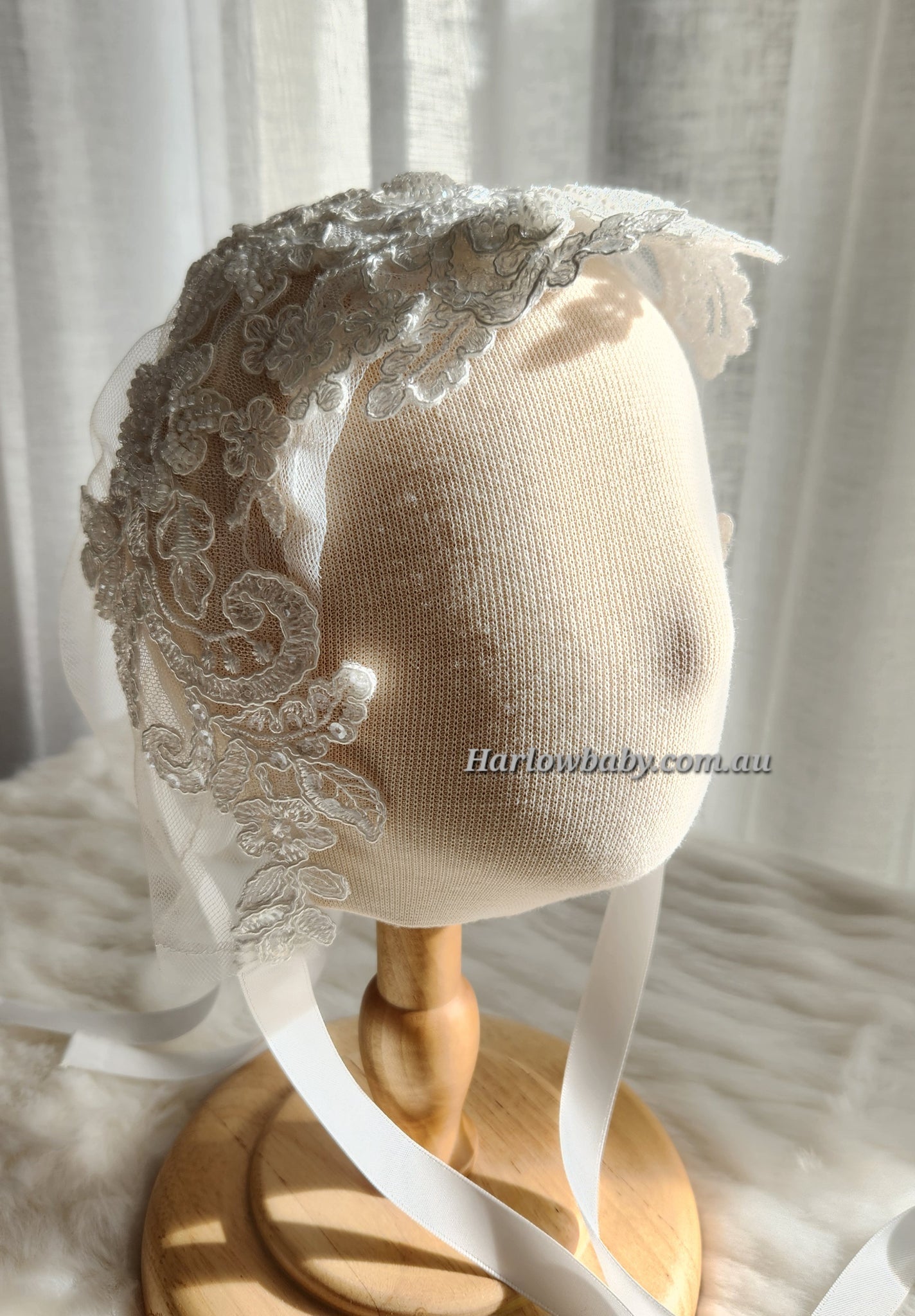 Our gorgeous Camila bonnet is made of a beautiful sequence and beaded floral lace that frames the face. There are ribbons at the bottom which ties into a bow and another ribbon at the back which is adjustable to make the bonnet smaller or bigger.