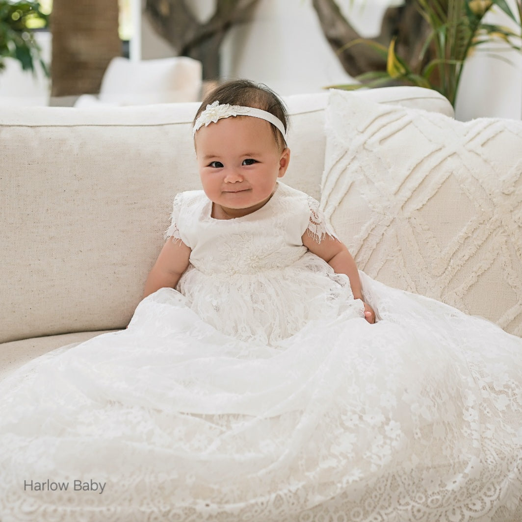 Our beautiful Sierra Gown consists of a gorgeous bold lace in ivory with two layers of soft bridal tulle and cotton lining. The lace has a striking floral pattern that is bound to draw complimenting attention. The sleeves are little cap sleeves using the same scallop edge as the skirt hem. It also has three fabric covered buttons at the back and an ivory ribbon around the waist that ties into a bow at the back.The gown does not come with beaded lace waistband seen in some of the pics- there is a plain ivory ribbon around the waistline.